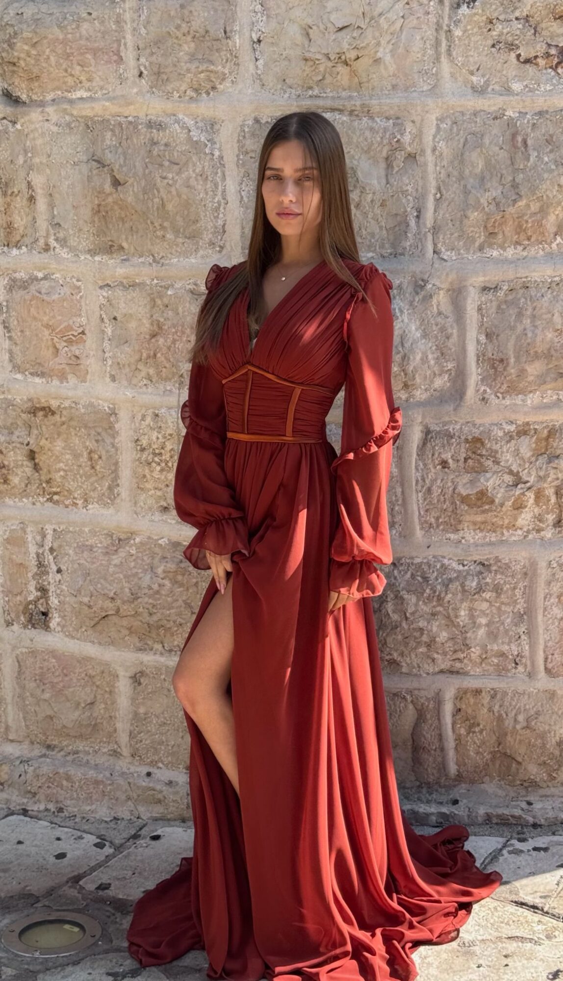 שמלת מחוך בעיצוב יניב רחמני בגוון חמרה מרהיב. השמלה מדגישה קווים נשיים ומעניקה למראה יוקרתי. מושלמת לאירועים מיוחדים – כשנשים רוצות להיות במרכז תשומת הלב
