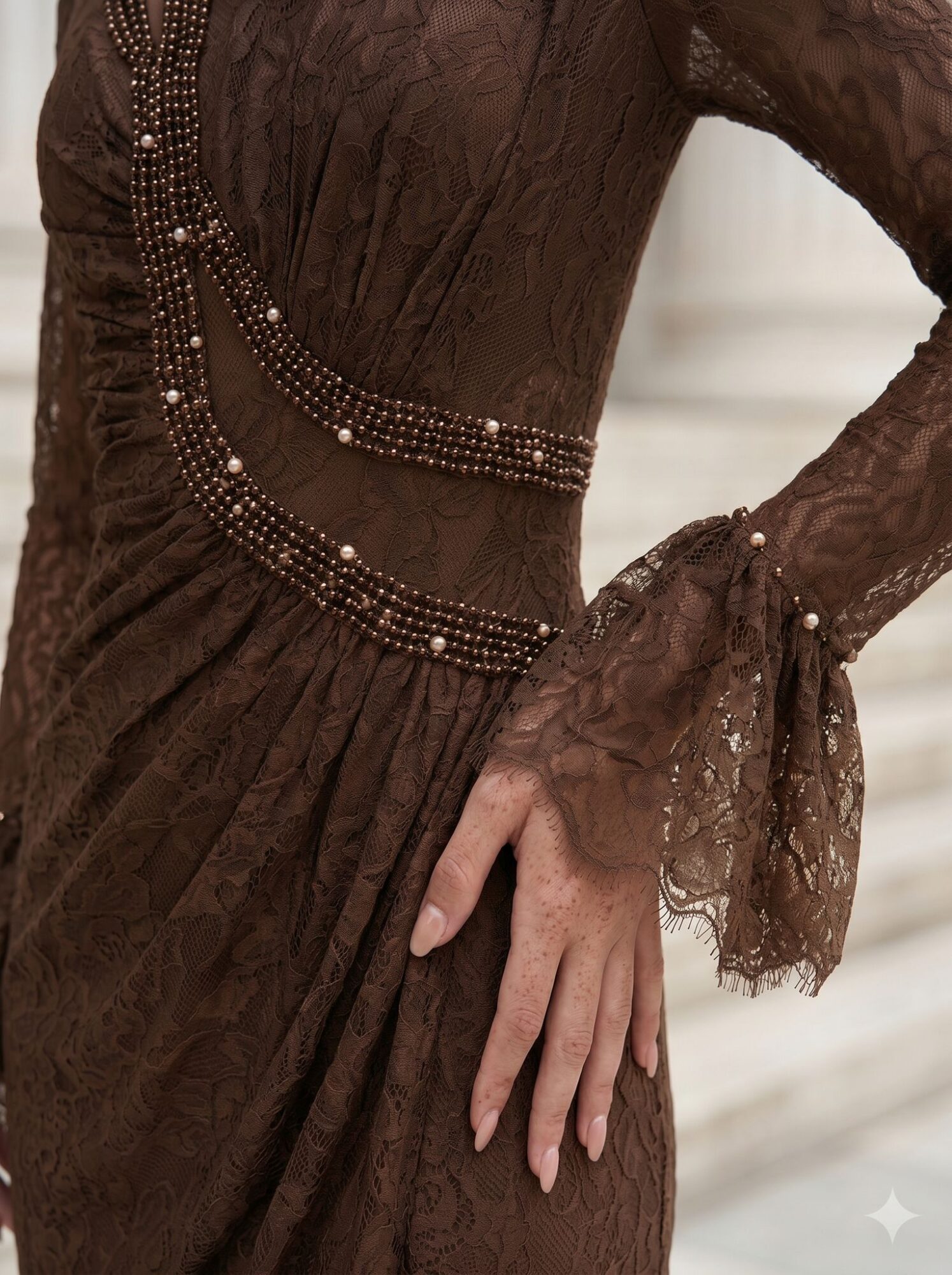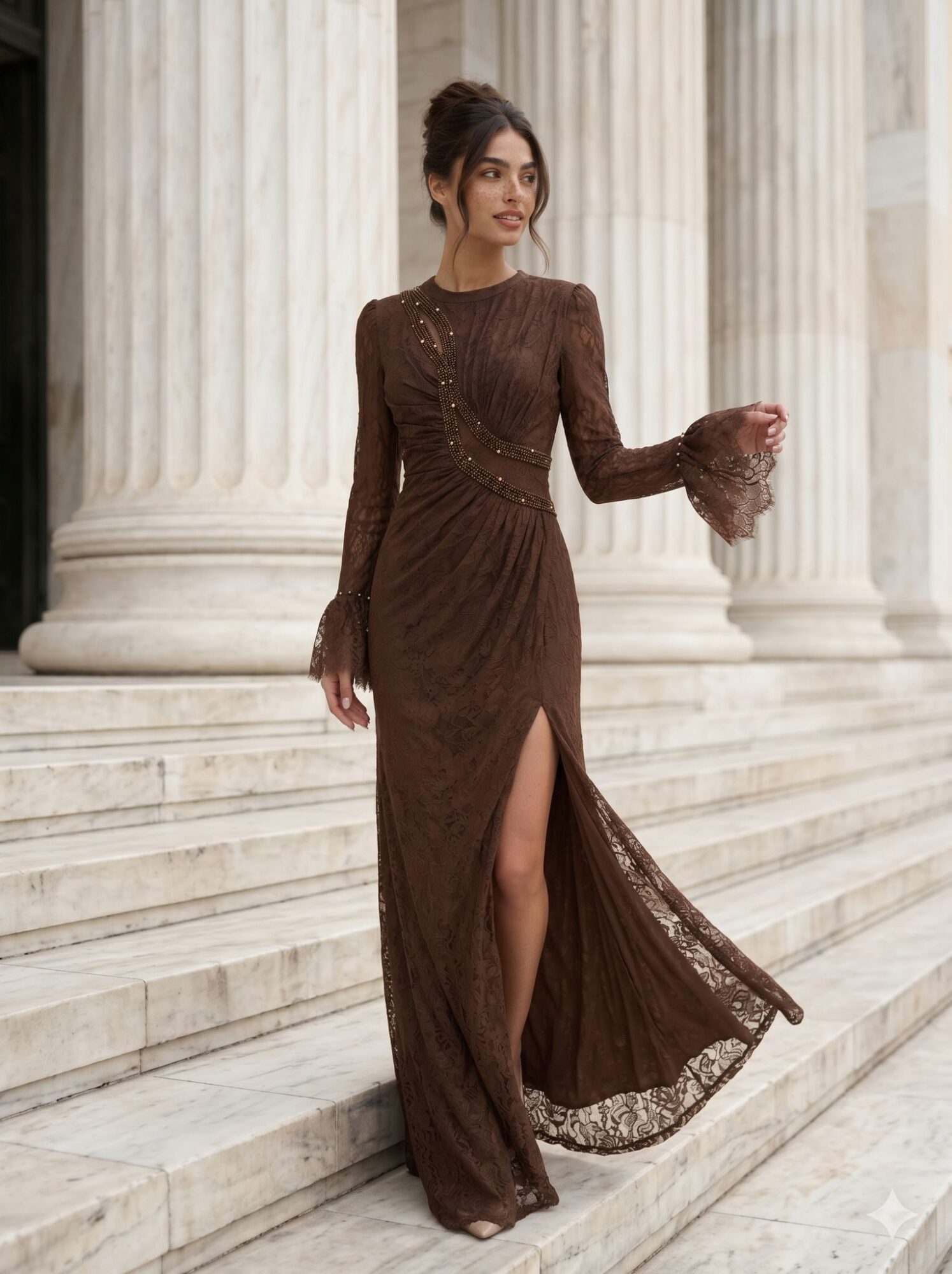 שמלת גוספין חומה היא שמלת ערב צנועה ויוקרתית בעיצוב קלאסי עם נגיעה מודרנית, מושלמת לאירועים, חתונות ולוקים אלגנטיים. השמלה עשויה תחרה עשירה בגוון חום עמוק, עם קפלים מחמיאים המדגישים את קווי הגוף ויוצרים מראה נשי ומתוחכם